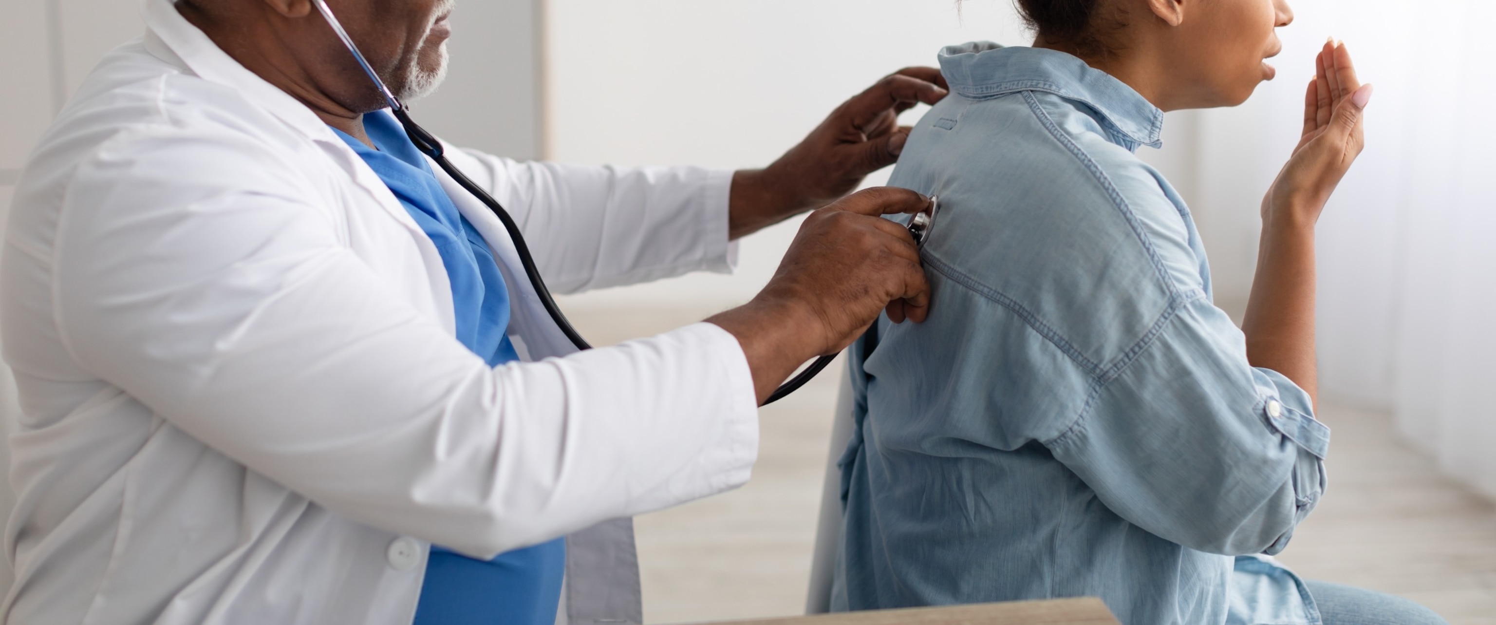 A general practitioner examines a coughing patient in a clinic, using a stethoscope.